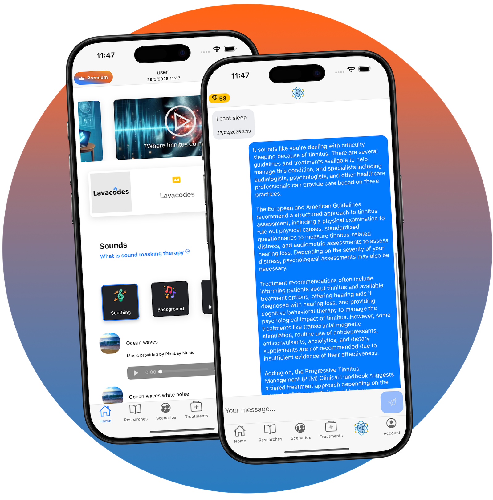 Personalized masking sounds and soundscapes powered by AI to soothe tinnitus symptoms and promote calm.